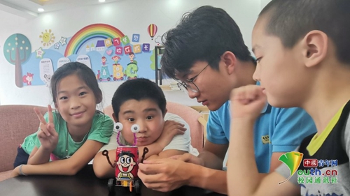 图为志愿者为孩子们介绍和演示由我院机器人应用与智能制造工作室同学们自主研发的Robot智能遥控车的基本构造与工作原理。中国青年网通讯员 刘云昊 摄