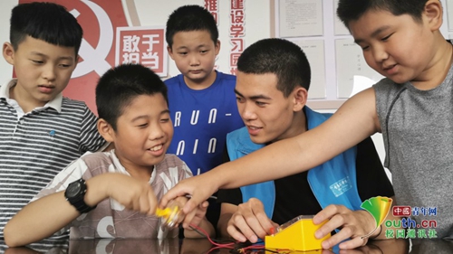 图为在物理实验课堂,志愿者们将奇妙的物理科学寓教于乐,围绕电磁学知识开展科学启蒙教育,带领小朋友们学习基本电路知识,一同探究隐藏在串联电路和并联电路的电压、电流规律。中国青年网通讯员 刘云昊 摄