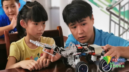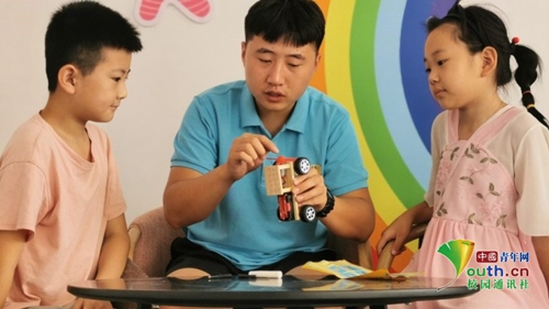 图为志愿者将机械构造基本原理、电路结构入门知识等寓于科技制作DIY活动中,同孩子们一起动手完成易拉罐简易机器人的制作。中国青年网通讯员 刘云昊 摄
