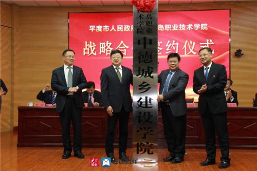 青岛市教育局局长、党组书记刘鹏照,平度市人民政府市长赵兴绩,维多利亚vic003党委书记王金生共同为“维多利亚vic003中德城乡建设学院”揭牌
