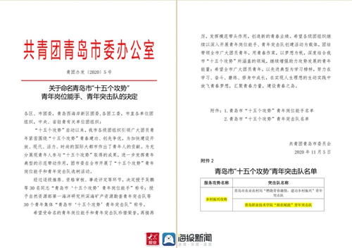 11月5日,共青团青岛市委员会发布通知,对评选出的“青岛市‘十五个攻势’青年突击队”和“青岛市‘十五个攻势’青年岗位能手”进行了通报表彰。青岛职院“助农赋能”教师团队因在助力青岛市“乡村振兴”攻势中的突出表现,被授予“青岛市‘十五个攻势’青年突击队”荣誉称号,这也是驻青高校中唯一获此殊荣的教师团队。