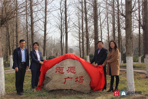 青岛职院党委书记王金生、党委副书记刘甲珉与嘉宾共同为学校志愿广场揭牌