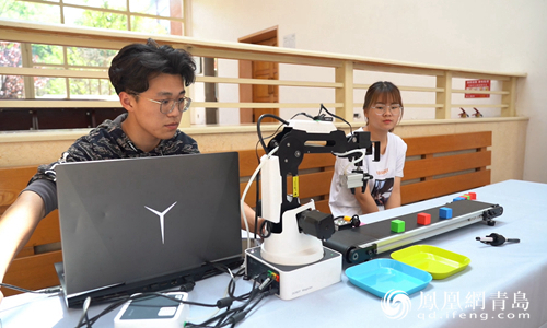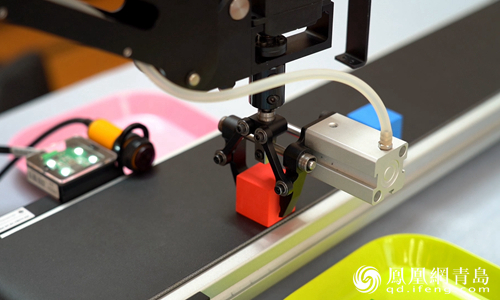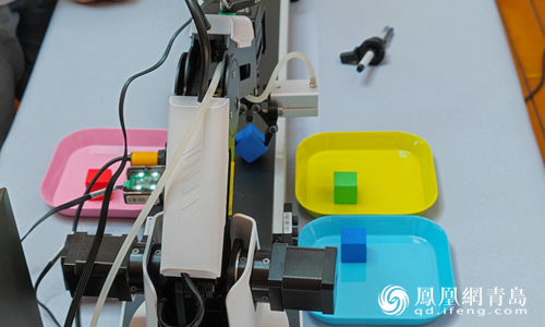 在展厅现场,来自工业机器人技术专业的两名同学为我们展示了他们制作的AI+机器视觉”产品——“垃圾自动分拣系统”:通过颜色识别模块红外光电传感器确定垃圾位置,利用微型处理器规划机械臂的运动轨迹,就这样,不同颜色的垃圾物块被分装到了各自的容器。