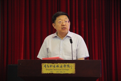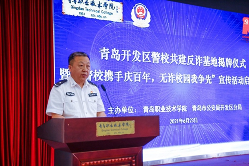 王金生在仪式上致辞。他代表学校党委对“青岛市西海岸新区警校共建反诈基地”基地成立表示热烈的祝贺,向一直关心支持学校发展的青岛市公安局开发区分局表示诚挚感谢。他指出,防范电信网络诈骗事关师生切身利益和学校安全稳定,是一项长期而艰巨的系统工程,必须高度重视。希望此次以“青岛市西海岸新区警校共建反诈基地”成立为契机,深度加强警校社多方联动,多措并举,全面实施“四个一”工程,探索构建预防网络电信诈骗“青职模式”,为高校反诈骗工作趟路子出经验、走在前作表率,以优异成绩向中国共产党百年华诞献礼。