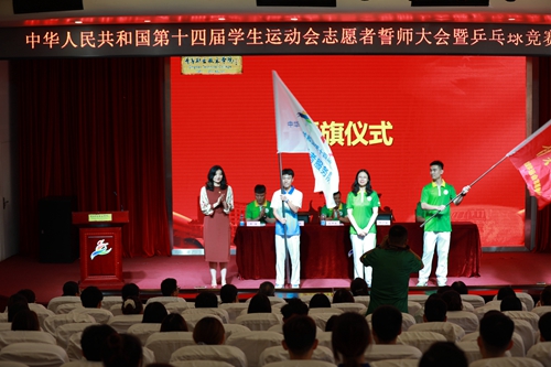 大会在庄严的国歌声中正式开始。李耀贤、邢广陆向志愿者团队授旗。志愿者代表韩试诚带领全体志愿者宣誓,郑重承诺践行志愿精神,凝聚青职力量,以良好的精神风貌、饱满的工作热情,勇当先锋、再立新功、戮力同心、青春献党。全体志愿者高举右手庄严宣誓,“请党放心,强国有我”,青春激昂的铮铮誓言响彻会场。他们将以饱满的青春热情和昂扬向上的精神面貌做好第十四届全国学生运动会乒乓球赛项志愿服务工作。