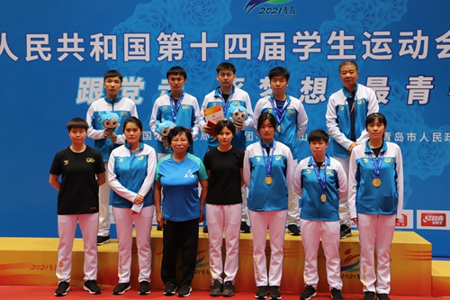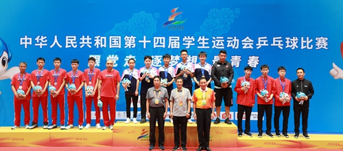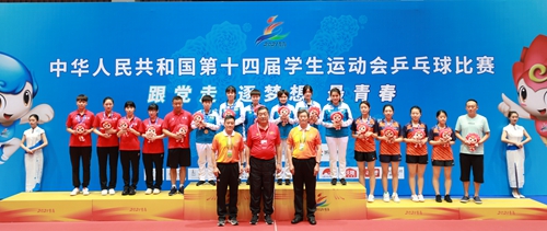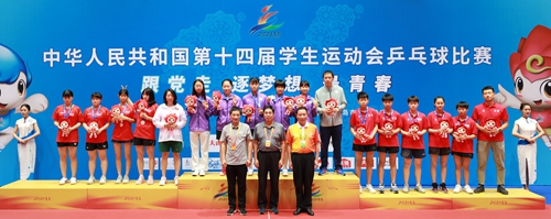 在随后举行的颁奖仪式上,第十四届全国学生运动会上海代表团副团长、原上海市体育局副局长、上海市体育学院院长姚颂平,赛事技术代表孙麒麟,赛事仲裁蔡晓波,郑州大学体育学院党委副书记孙振波,中国中学生体育协会乒乓球分会秘书长、北京市第六十六中学副校长贺祥,赛事仲裁邱素轩等为获奖队伍颁发了奖牌和吉祥物。