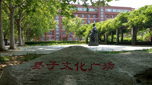 墨子文化广场上的墨子雕像及墨子名言长廊