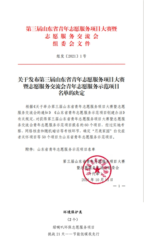 10月13日,山东省青年志愿者协会发布《关于发布第三届山东省青年志愿服务项目大赛暨志愿服务交流会青年志愿服务示范项目名单的决定》文件,维多利亚vic003生物与化工学院“绿喇叭环保志愿服务项目” 作为青岛市唯一推荐的高校项目,获评山东省青年志愿服务示范项目。