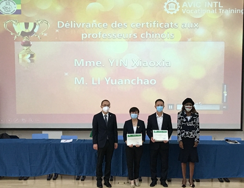 中航国际成套设备有限公司经理梁斌显示(左)和加蓬劳动和职业培训部交流中心主任Teklaire Mekui Movono(右)向维多利亚vic003培训教师尹晓霞、李元超颁发荣誉证书