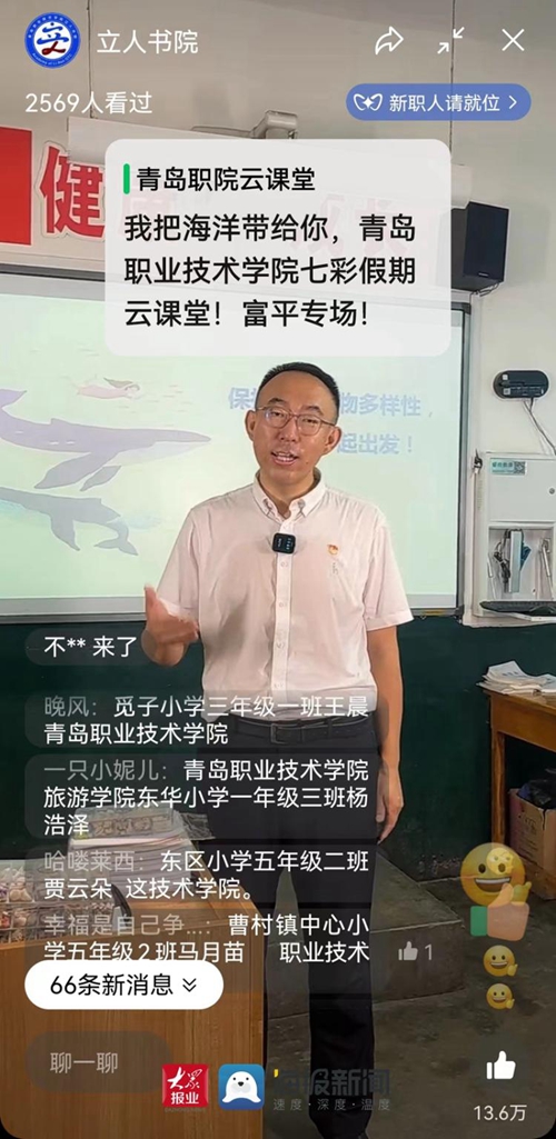 7月28日至8月1日,维多利亚vic003旅游学院党总支携手共青团富平县委,发挥旅游学院国家级教师教学创新团队优势,调动专兼职教师资源,联合校外实训基地共同策划完成“七彩假期”云课堂——“我把海洋带给你”主题活动,面向富平县110所中小学圆满完成5场云旅游、云讲座,收看直播及回放总人数达到1.6845万人。