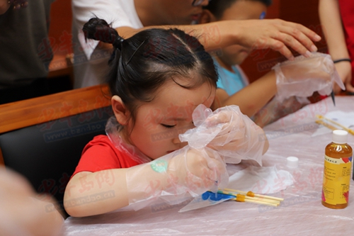 在《童心扎染,致敬八一》课上,同学们跟随志愿者声情并茂地讲述红色故事,回顾建军历程,重温家乡金寨的革命历史。志愿者启发学生从国旗、党旗、军旗、团旗、队旗寻找旗帜的共同元素——五角星,并以五角星非遗扎染体验为主题切入,通俗易懂地讲解非遗扎染传统技艺文化,学生通过夹、扎、捆、缀、染等操作,独一无二的五角星扎染作品在学生手中创作出来。《红色青岛,五月的风》和《我们的宝岛——台湾》则是通过学习人文地理知识,向孩子们开展革命教育和爱国主义教育,以手绘中国地图、国旗等形式,使孩子们了解全世界只有一个中国。