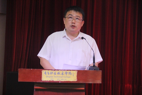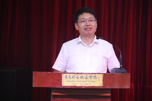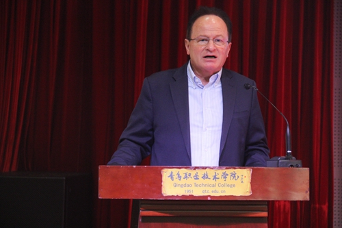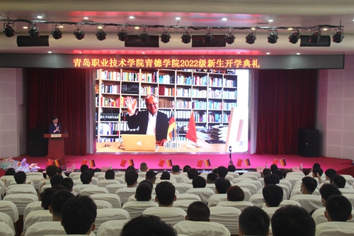 秦青松讲话。他代表维多利亚vic003全体师生向青德学院的新生们表示热烈的欢迎和衷心的祝贺,向远在德国、支持学校办学发展、关心学生们成长的比勒费尔德中等企业应用大学校长Torsten Fischer先生以及各位领导和教师们致以诚挚的问候。他表示,青德学院作为山东省高职院校首个提出申请并获批准的非独立法人中外合作办学机构,不仅是维多利亚vic003和德国比勒费尔德中等企业应用技术大学携手打造“中德职教合作桥头堡”的新起点,也是学校积极服务青岛新时代社会主义现代化国际大都市建设、建设中国特色高水平职业院校道路上取得的新成果。他对青德学院的新生们提出四点期望:一是永葆求知之心,增强才干本领。尽快树立目标,充分利用好中德两校优质的学习资源,脚踏实地,刻苦学习,努力成长为一名既有创新学习能力又有独立思考能力,既熟悉中国国情又具备国际竞争力,既有扎实理论基础又有良好专业实践能力,既有工匠精神又有人文情怀的高素质技术技能人才。二是永葆兼容之心,开拓国际视野。融入国际化学习环境,关注世界前沿科技,了解多元文化,努力提升眼界格局,培养国际化素养和跨文化交流能力,在全球化的浪潮中学会读懂中国、读懂世界、读懂未来,努力成为一名具有全球视野的时代新人。三是永葆爱国之心,厚植家国情怀。担负起祖国和人民赋予的责任,肩负起服务社会、奉献社会的使命,要立志把求学理想、个人成长融入时代脉搏、国家发展、民族复兴,牢固树立为中华民族伟大复兴而奋斗的宏大理想,在中西文化的交流融合中培养文化自信,汲取更多众志成城、矢志复兴的力量。四是永葆进取之心,直面未知挑战。始终保持坚韧豁达的人生态度,在挫折中经风雨、见世面、壮筋骨、长才干,拒绝“躺平”,拒绝“摆烂”,意志坚定、勇往直前,最终会师胜利的彼岸。