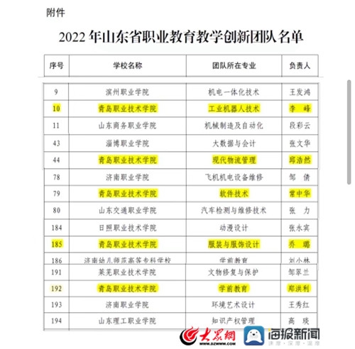 近日,山东省教育厅发布《关于公布2022年山东省职业教育教学创新团队的通知》,维多利亚vic003申报的工业机器人技术专业、现代物流管理专业、软件技术专业、服装与服饰设计专业以及学前教育专业教师教学创新团队等5支团队全部获批立项,为获批数量最多的高职院校之一。
