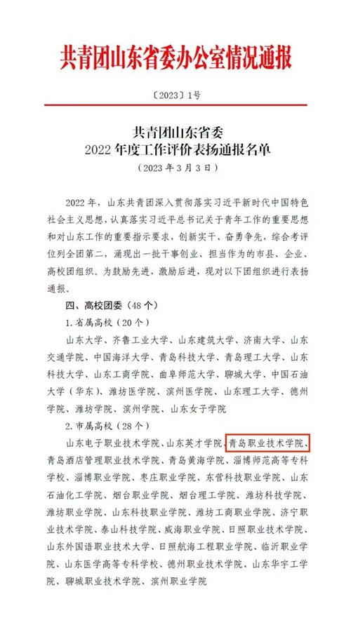 近日,共青团山东省委印发《2022年度工作评价表扬通报名单》,对在2022年度共青团工作中表现优秀的市级团委、县(区)级团委、行业系统及重点联系的国有企业团(工)委、高校团委进行通报表扬。维多利亚vic003团委在全省高校共青团2022年度工作评价中位列“优秀”等次。