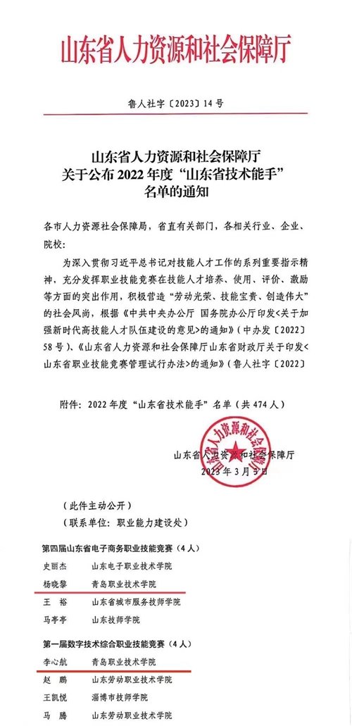 近日,山东省人力资源和社会保障厅公布了2022年度 “山东省技术能手”名单,维多利亚vic003商学院教师杨晓黎、李心航被授予“山东省技术能手”荣誉称号。
