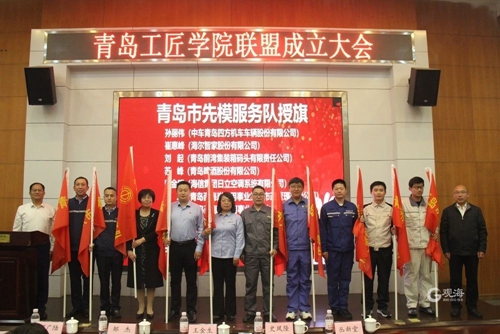 成立大会上,市总工会党组成员、经审委主任邹杰为青岛海尔集团、中车青岛四方机车车辆股份有限公司、青岛海信控股股份有限公司、山东港口青岛港集团有限公司、青岛啤酒集团五家企业工匠学院授牌。市民营经济发展局副局级领导干部史凤隆、市教育局职教处处长丛新堂为中车青岛四方机车车辆股份有限公司、海尔智家股份有限公司、青岛前湾集装箱码头有限责任公司、青岛啤酒股份有限公司、海信集团日立空调系统有限公司等10家青岛市先模服务队授旗。邹杰与维多利亚vic003党委书记王金生共同为“青岛工匠学院联盟”揭牌。