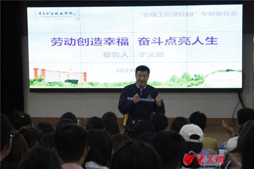 全国五一劳动奖章获得者、青岛真情巴士集团有限公司公交驾驶员于义睦作“劳模工匠进校园”专题报告会