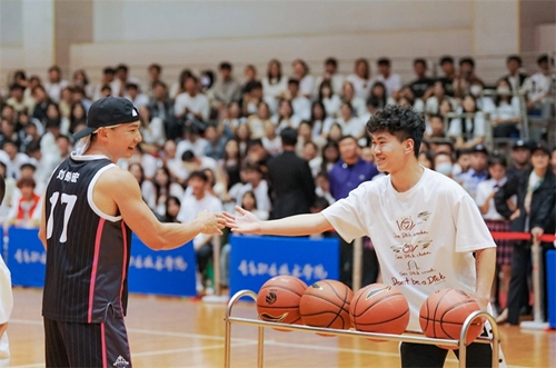 “下面是激动人心的花式投篮互动挑战,哪位同学能够上来进行挑战?”花式投篮互动挑战、3对3对抗赛、5对5对抗赛、花式扣篮,现场,刘畊宏携球员冯周演、张鸿林、陈传亮、李沁纯与青岛西海岸新区球队“以球会友”,进行了一场精彩的比赛。刘畊宏团队频繁邀请维多利亚vic003的学生们上场互动,你来我往之间,引起在场观众的阵阵呼喊。