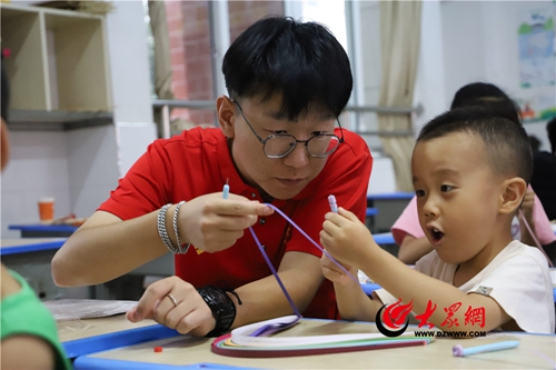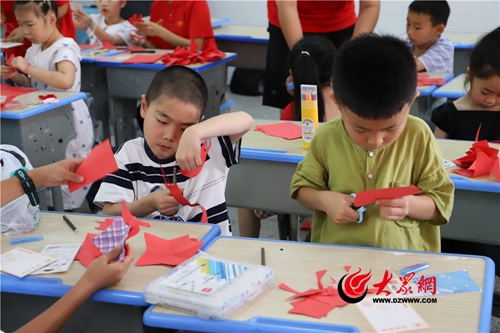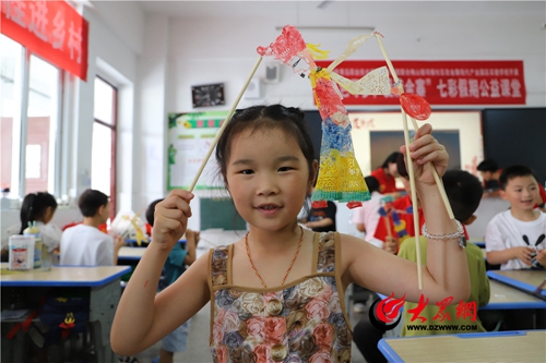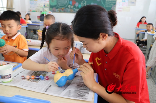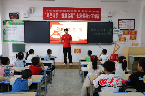 2023年,是“红色寻梦,爱满金寨”志愿服务队第二次为革命老区的孩子们带来七彩假期公益艺术课程,团队结合第一次支教时掌握的学情和经验,打造适合金寨6岁至10岁少年儿童的“德育+美育”协同育人支教课程体系,创新实施“美·德”融合性文化素质类课程,研发包含胶州剪纸、胶州年画、泰山皮影、即墨泥塑、菏泽面塑、潍坊风筝等22门适合金寨少年儿童学习的特色文化课程,将传承中华优秀传统文化与赓续红色革命文化相结合,注重将“德育”红色文化、中华优秀传统文化融入“美育”启蒙课程。