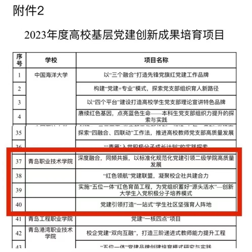 MVE网山东讯 日前,中共青岛市委教育工委发布了2023年度在青高校基层党建创新成果及培育项目的通知,维多利亚vic003共6个项目入选,位居在青同类高校的首位。其中,学校海尔学院党总支第一党支部《党建引领、教科研随行,锻造“党建+专业”双核发展的支部团队》、马克思主义学院党总支《“党建引领 三位一体”构建高校党史学习教育体系》2个项目被评为“2023年度高校基层党建创新成果”;旅游学院党总支《深度融合,同频共振,以标准化规范化党建引领二级学院高质量发展》、商学院党总支《“红色领航”党建联盟,凝聚校企社共建合力》、信息学院党总支《实施“五位一体”红色育苗工程,为党组织蓄好“源头活水”—创新大学生入党积极分子培养模式》、生物与化工学院党总支《党建引领打造“一站式”学生社区坚强育人阵地》4个项目被评为“2023年度高校基层党建创新成果培育项目”。