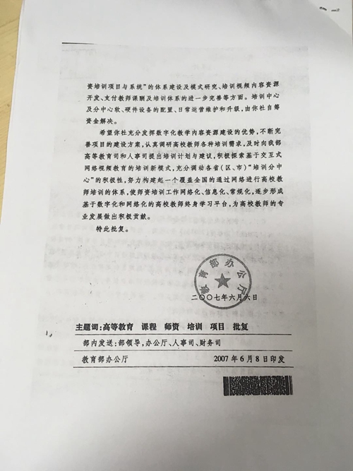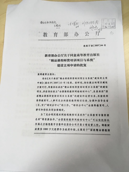 附件:教育部办公厅关于同意高等教育出版社“精品课程师资培训项目与系统”建设立项申请的批复